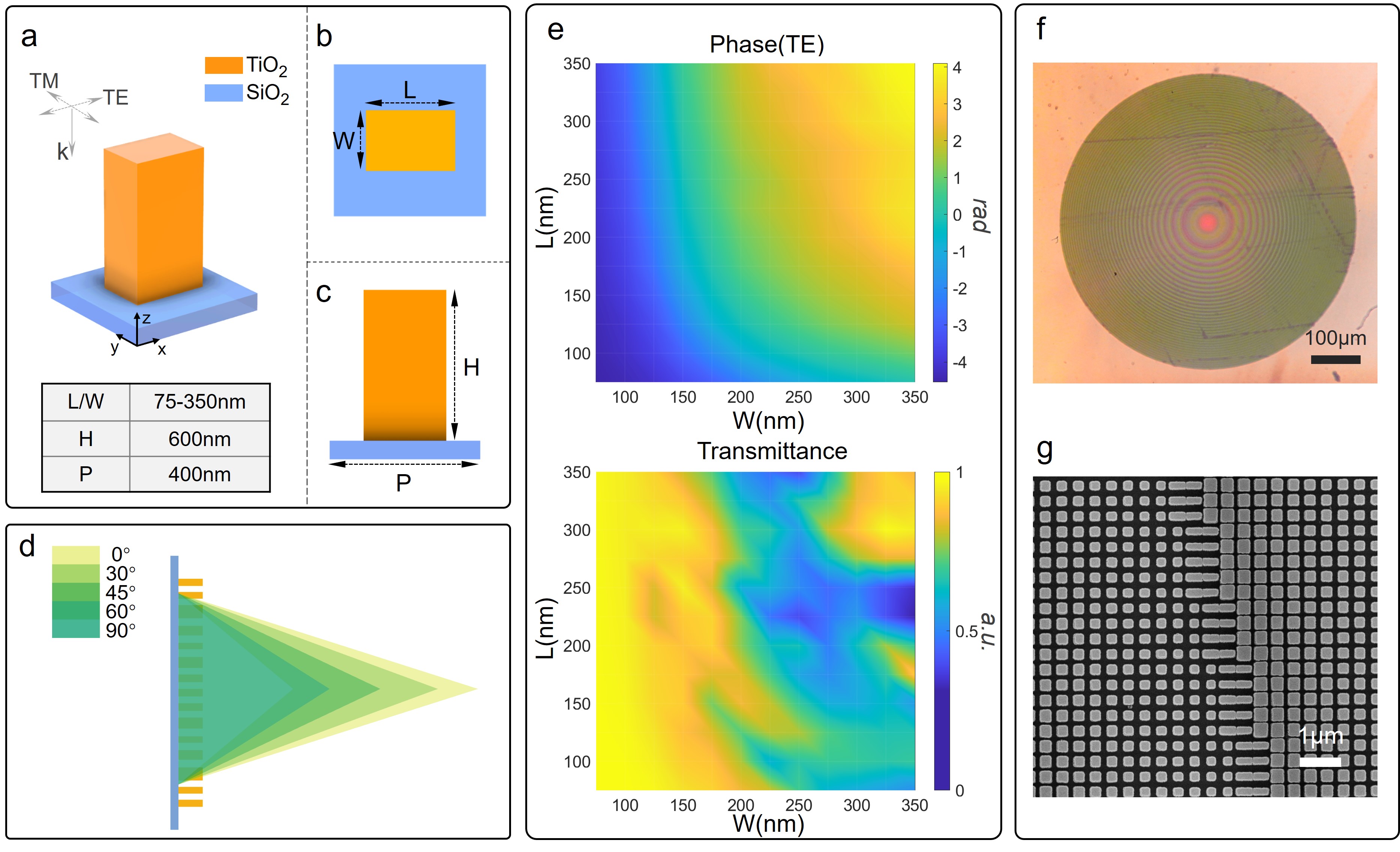 Figure 1. Schematics and design of the varifocal metalens. (a−c) Schematic illustration of a unit cell of the metalens, nanopillar have W or L from 75 to 350 nm, and H = 600 nm, with center-to-center spacing P = 400 nm. (d) Schematic diagram of polarization-related continuous zoom. (e)Phase and transmittance distribution maps corresponding to different W and L of nanopillars under TE mode polarized light illumination. (f, g)Photos of metalens taken under the microscope and SEM.