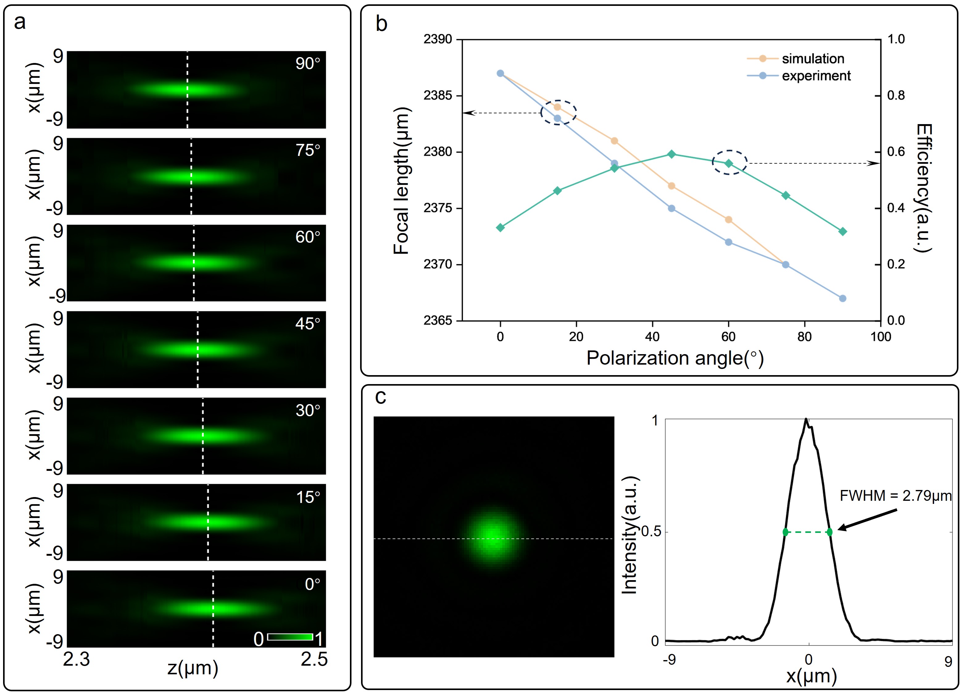 Figure 2. Experimental characterization results of the metalens. (a) Focusing performance of the metalens at different polarization angles. (b) Focal length variation curves in simulation and experiment, as well as experimentally measured focusing efficiency of the metalens under 0−90° polarized light illumination. (c) Focal spot intensity and full width at half-maximum (fwhm) of the metalens under TE polarization (0°) illumination.