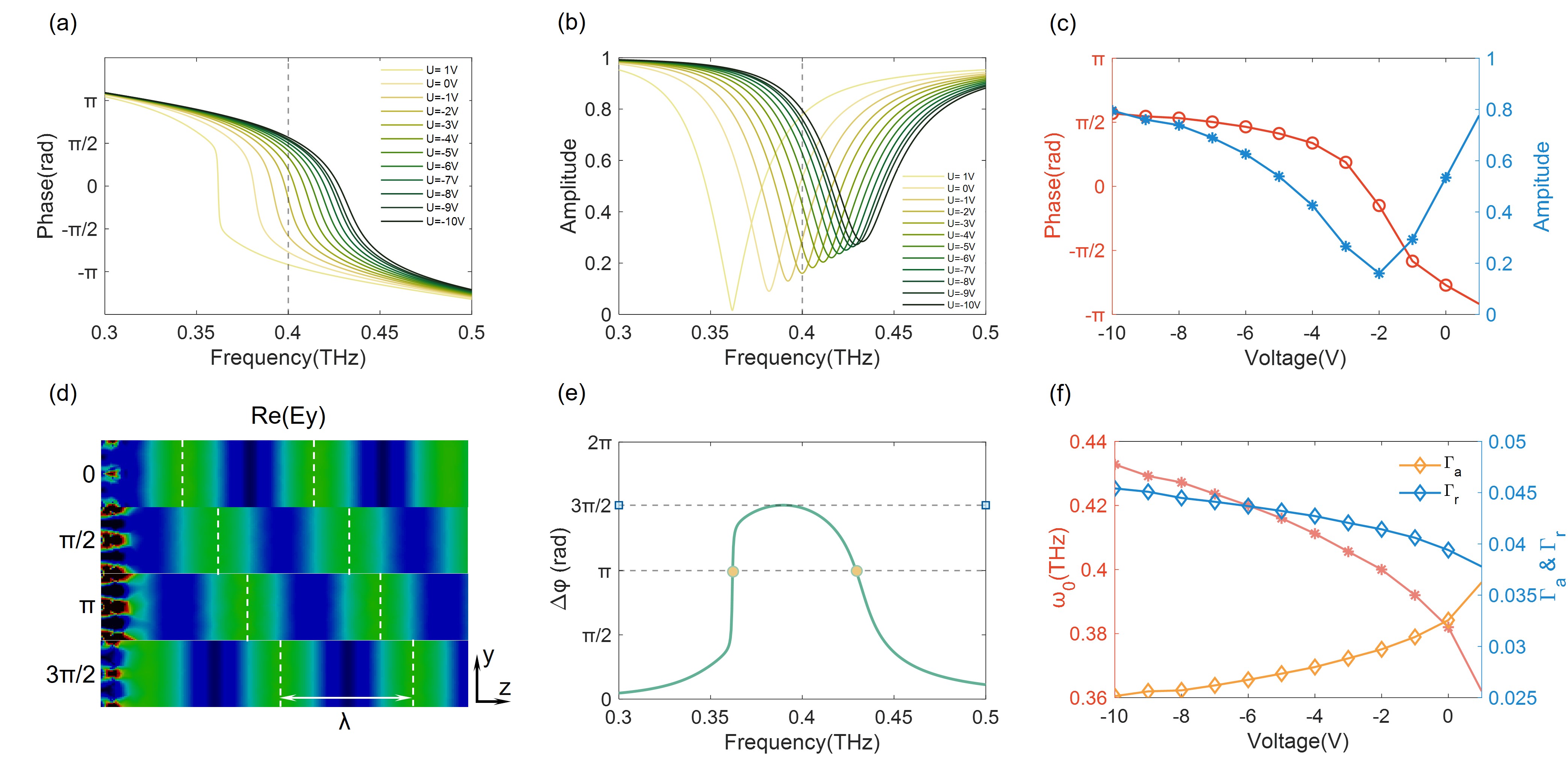 Figure 2. (a) and (b) The reflected phase and amplitude of metasurface biased by different voltages. (c) The phase and amplitude response at 0.4 THz with different voltage. (d) Reflected wavefront of fourth-order phase modulation at 0.4 THz for normal incidence. (e) Phase modulation depth at different frequencies. (f) The relationship between resonance frequency, absorption loss, radiation loss, and applied voltage.